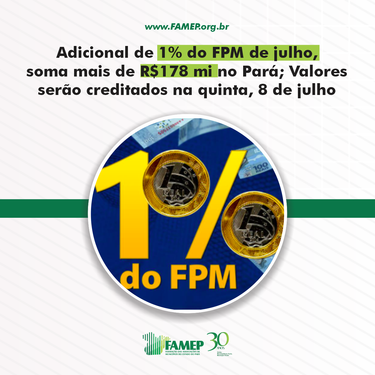 Resultado da Emenda Constitucional 84/2014, uma conquista da Confederação Nacional de Municípios (CNM) e da Federação das Associações de Municípios do Estado do Pará (FAMEP), o adicional de 1% do Fundo de Participação dos Municípios (FPM) em julho somará R$ 178.361.699,50. Os valores serão creditados para as prefeituras na quinta-feira, 8 de julho, até as 18 horas.