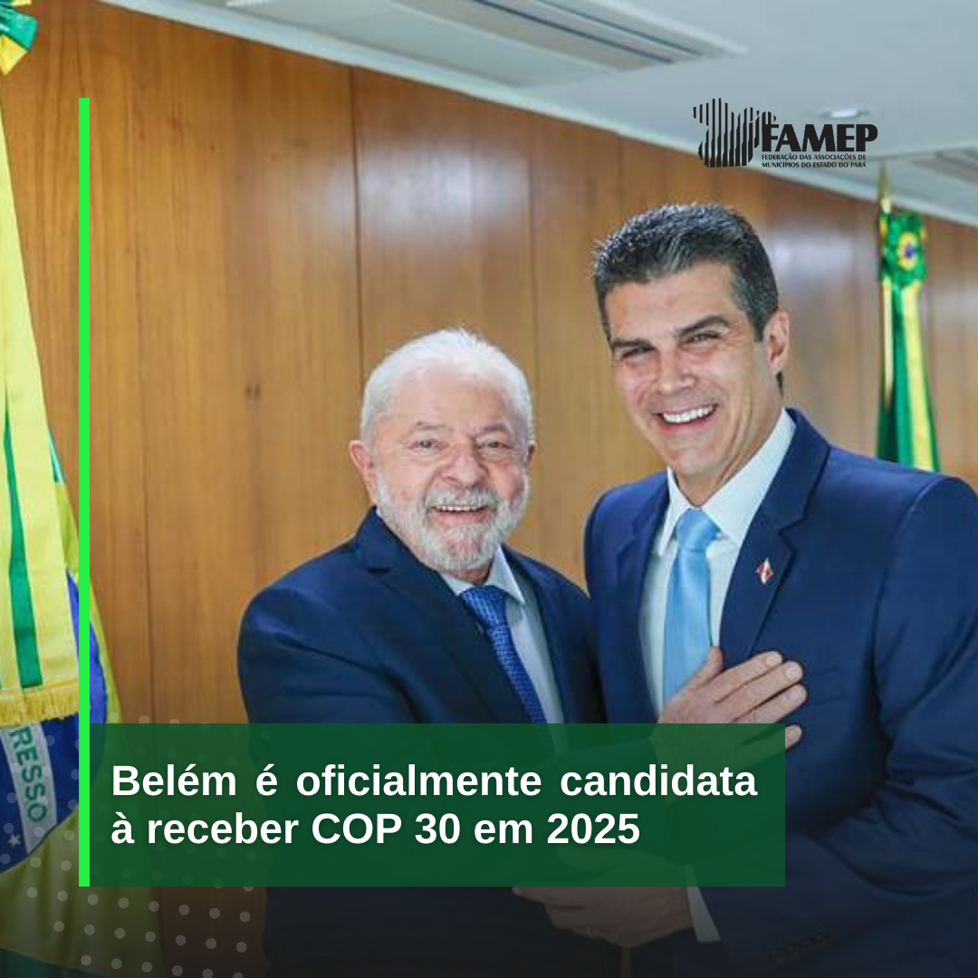 A Federação das Associações de Municípios do Estado do Pará (FAMEP) comemora a notícia que foi dada após reunião com o presidente Luiz Inácio Lula da Silva, na manhã desta quarta-feira, 11 de janeiro, em Brasília, na qual o governador do Pará e presidente do Consórcio Interestadual de Desenvolvimento Sustentável da Amazônia Legal (CAL), Helder Barbalho, informou que a capital paraense, Belém, é a cidade brasileira escolhida como candidata oficial do país para sediar uma edição da Conferência das Nações Unidas sobre as Mudanças Climáticas (COP 30) em 2025.