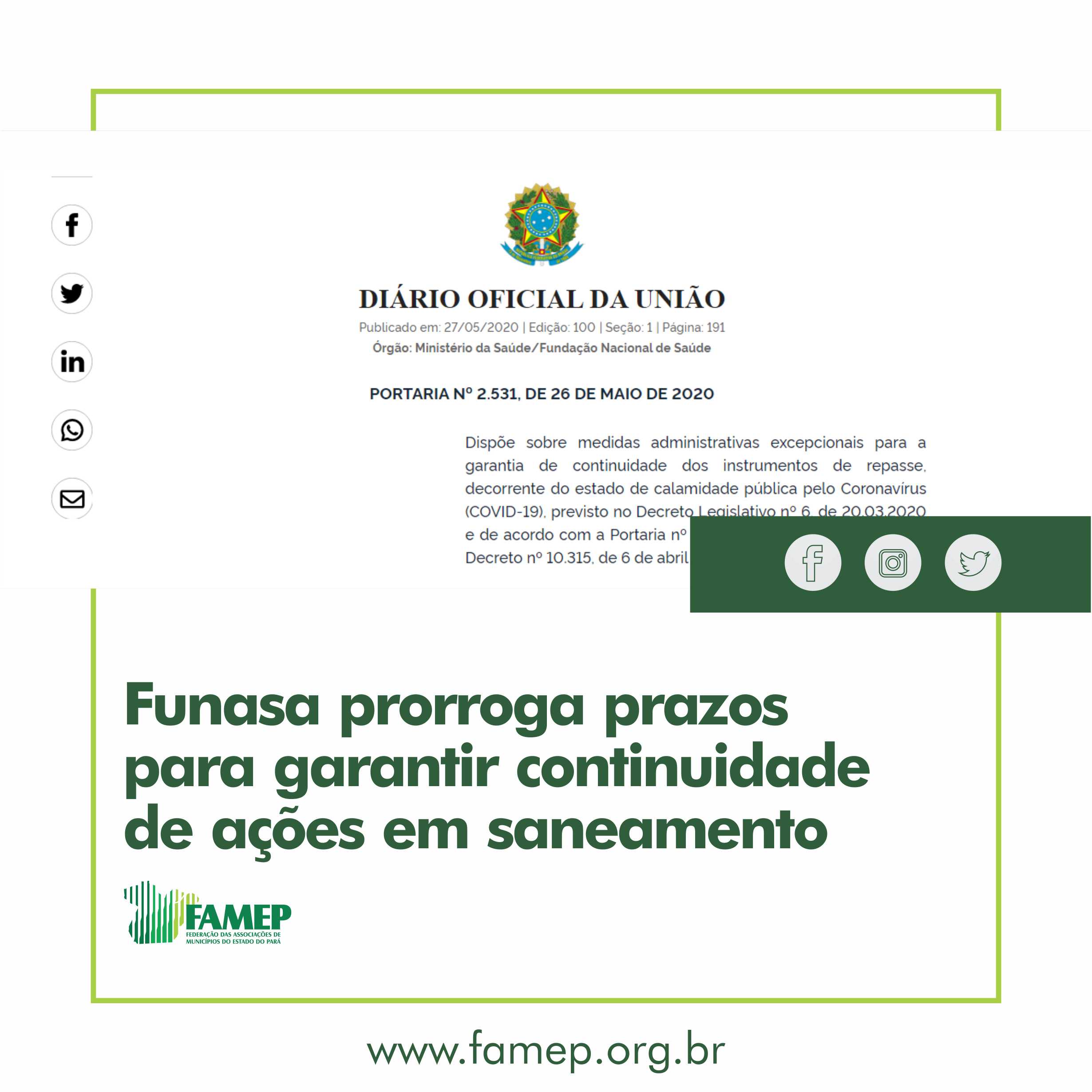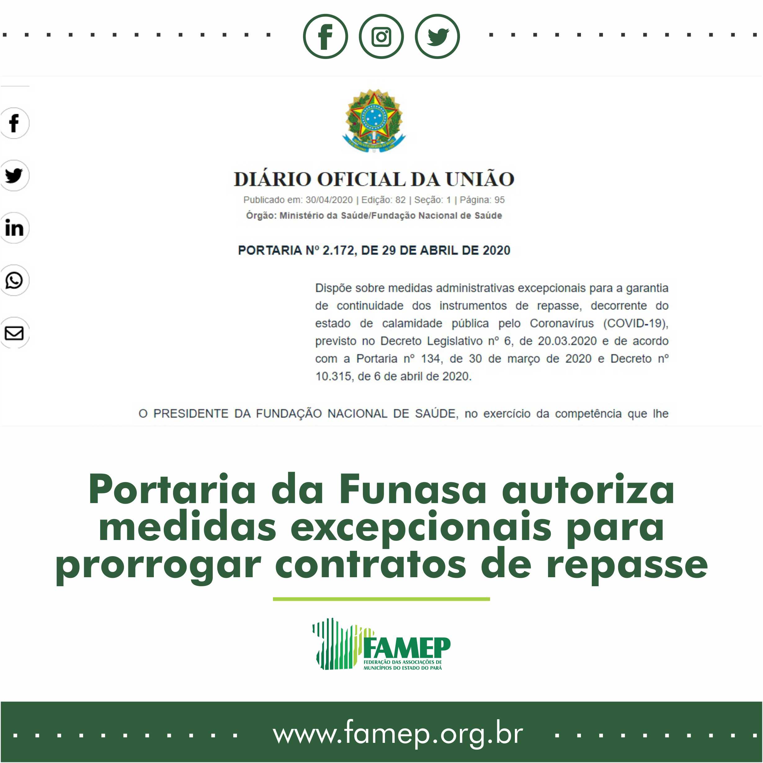 Portaria da Funasa autoriza medidas excepcionais para prorrogar contratos de repasse 21 de maio de 2020