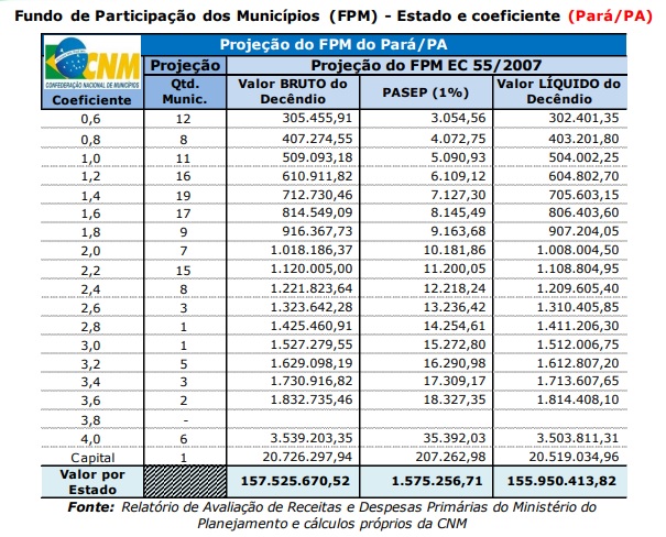 Uma das conquistas do movimento municipalista e tão esperado pelos gestores municipais para o fechamento das contas no fim de ano, o recurso do 1% adicional do Fundo de Participação dos Municípios (FPM) para o Estado do Pará em dezembro de 2019 deverá chegar a pouco mais de R$155 milhões, em valores líquidos. O levantamento foi feito pela Confederação Nacional de Municípios (CNM), com o objetivo de auxiliar os gestores no planejamento orçamentário. Os dados levam em conta informações divulgadas pelo governo federal – que informou que o crédito será feito em 9 de dezembro.