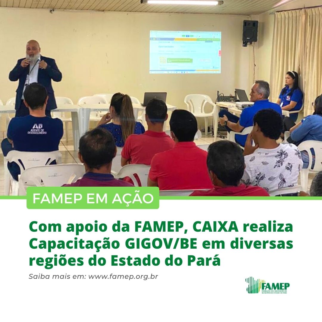 A Caixa Econômica Federal com apoio da Federação das Associações de Municípios do Estado do Pará (FAMEP) e das Associações e Consórcios Regionais promoveu uma séria de Capacitações do GIGOV/BE. Foram alcançadas até agora a região metropolitana, região do Carajás e Araguaia, Baixo Amazonas e Tapajós e Marajó, a intenção é levar o seminário ainda para os municípios de Bragança e Altamira.