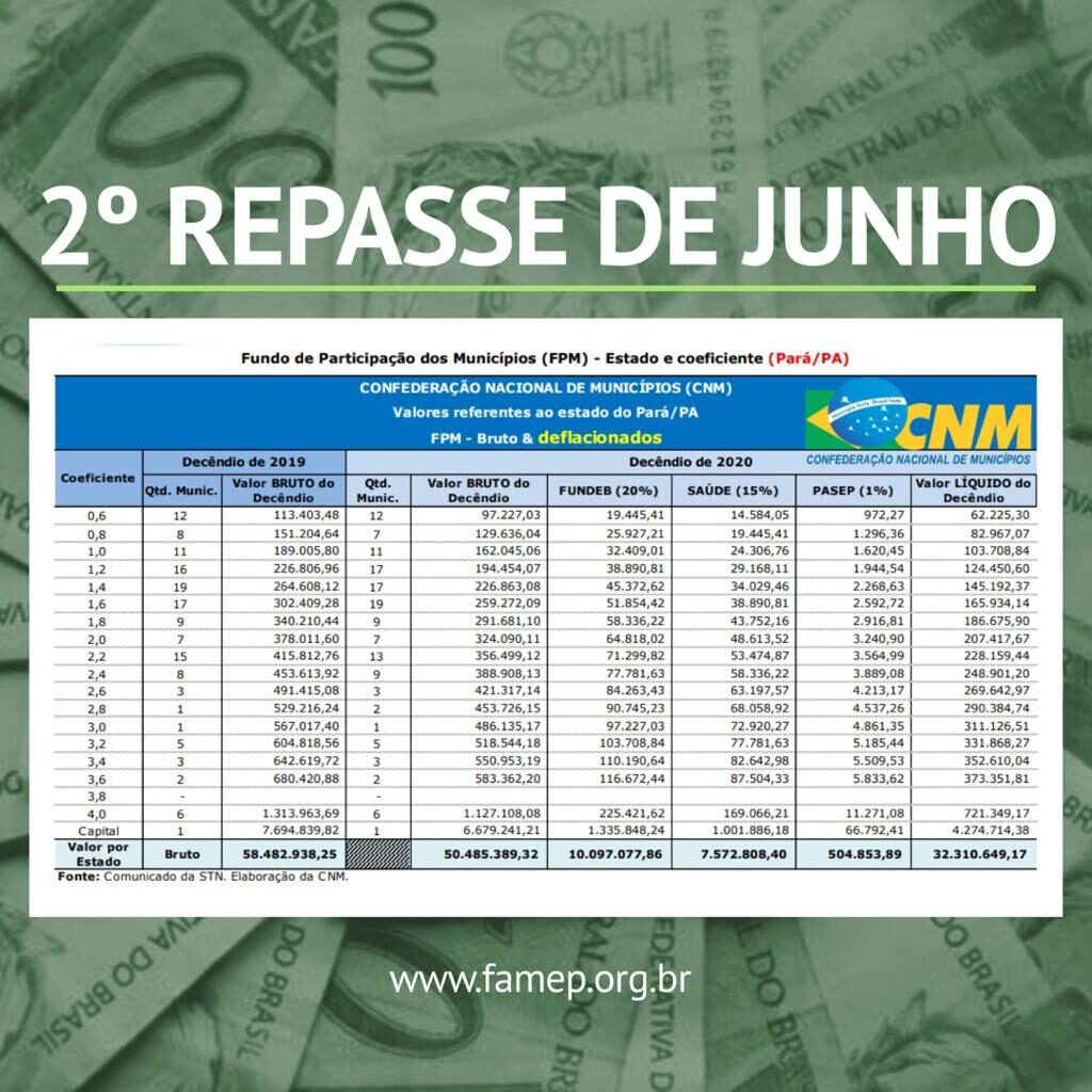 As prefeituras paraenses recebem nesta sexta-feira, 19 de junho, o segundo repasse do Fundo de Participação dos Municípios (FPM). O montante partilhado será de R$ 32.310.649,17, já descontada a retenção do Fundo de Manutenção e Desenvolvimento da Educação Básica e de Valorização dos Profissionais da Educação (Fundeb). Como era esperada, a transferência apresenta queda de 15,30% quando é levada em consideração a inflação do período. Apesar de estar prevista a recomposição do Fundo, a Confederação Nacional de Municípios (CNM) e a Federação das Associações de Municípios do Estado do Pará (FAMEP) pedem cautela aos prefeitos na gestão dos recursos, principalmente nesse período de pandemia.