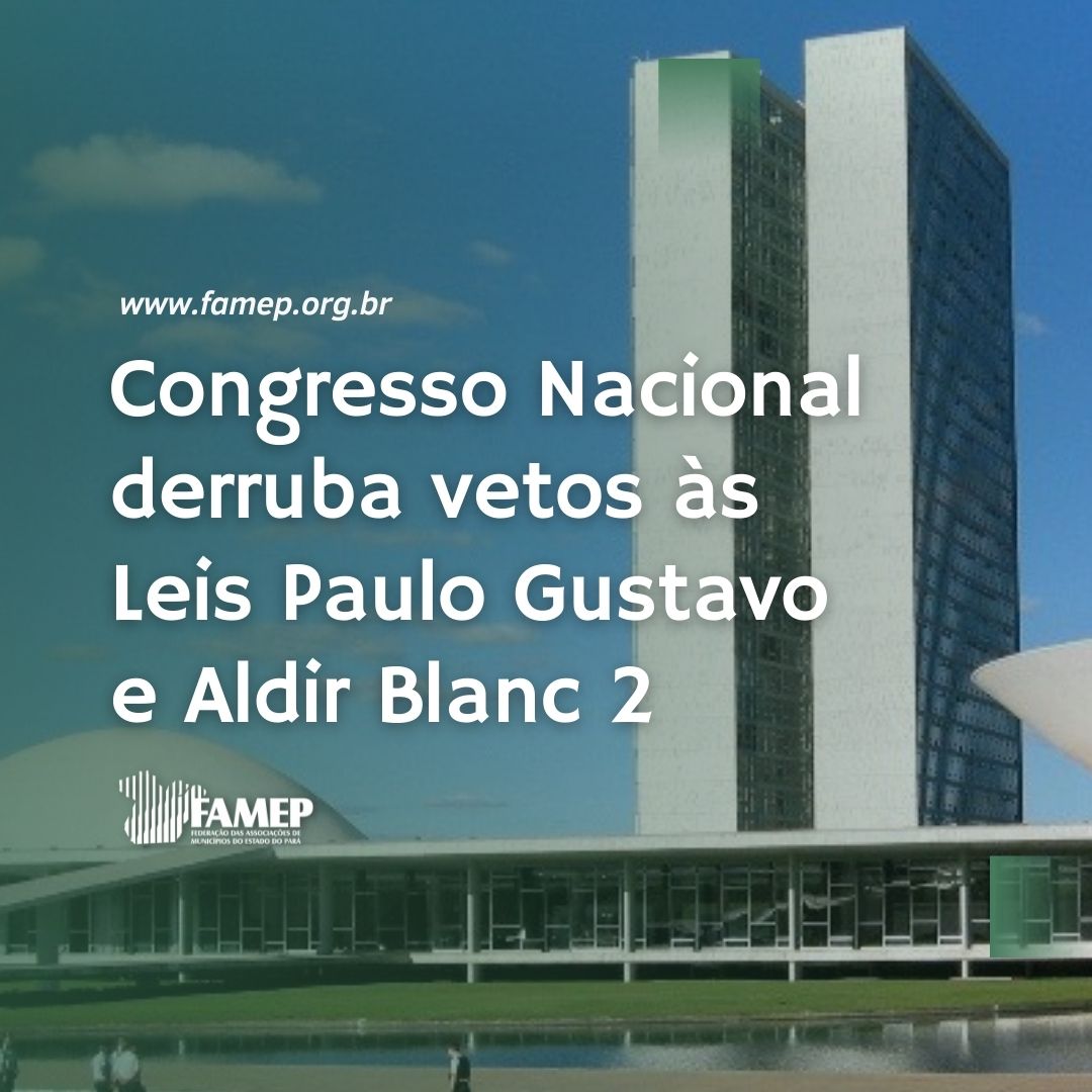 A Confederação Nacional de Municípios (CNM) e a Federação das Associações de Municípios do Estado do Pará (FAMEP) comemoram a derrubada pelo Congresso Nacional dos vetos presidenciais ao Projeto de Lei Complementar (PLP) 73/2021, chamado de Lei Paulo Gustavo, e ao Projeto de Lei (PL) 1.518/2021, que institui a Política Nacional Aldir Blanc de Fomento à Cultura, conhecida como Lei Aldir Blanc 2. Agora, os textos irão à promulgação.
