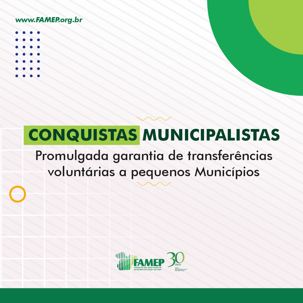 A medida que permite transferências voluntárias a Municípios com até 50 mil habitantes, mesmo que estejam em situação de inadimplência, foi promulgada. A alteração ocorreu na Lei de Diretrizes Orçamentárias (LDO) de 2021, após derrubada de veto pelo Congresso Nacional. A promulgação da Lei 14.143/2021 foi publicada na edição de 11 de junho do Diário Oficial da União. A Confederação Nacional de Municípios (CNM) com apoio da Federação das Associações de Municípios do Estado do Pará (FAMEP), atuou diretamente com os parlamentares para aprovação do tema e posterior derrubada do veto.