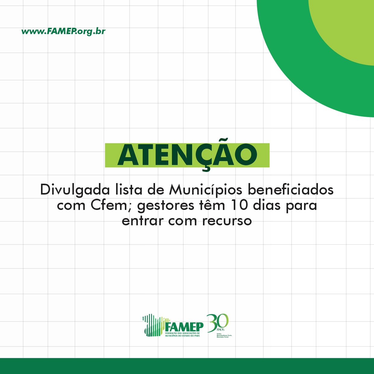 A Confederação Nacional de Municípios (CNM) e a Federação das Associações de Municípios do Estado do Pará (FAMEP), fazem um alerta aos municípios paraenses afetados pela atividade de mineração e que são beneficiários de parcela da Compensação Financeira pela Exploração de Recursos Minerais (Cfem). Esses Entes têm o prazo de 10 dias para entrar com recurso. Confira a listagem que a Federação fez com um resumo dos municípios paraenses que estão na lista de beneficiários.