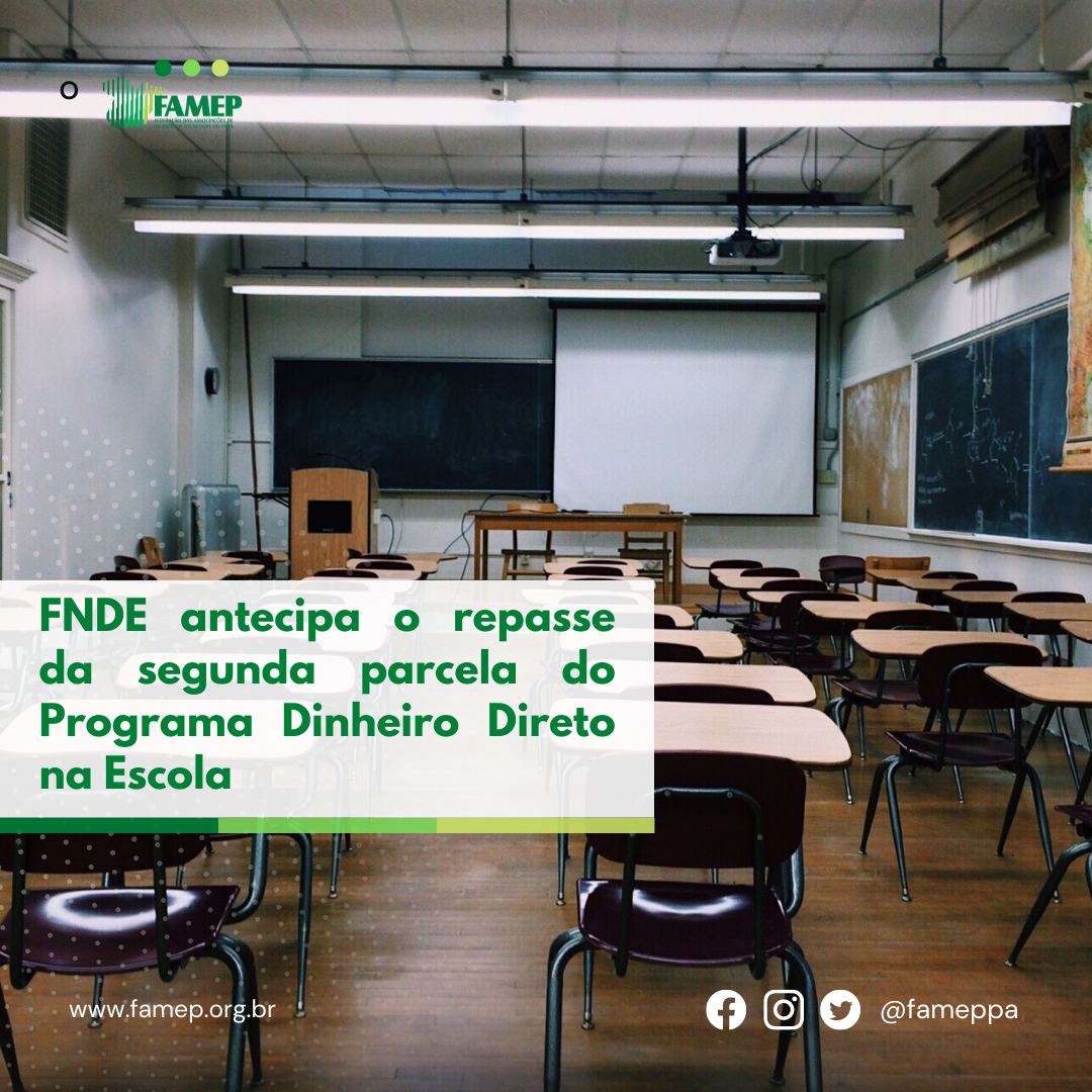 A Federação das Associações de Municípios do Estado do Pará (FAMEP) informa que o Fundo Nacional de Desenvolvimento da Educação (FNDE) transferiu R$ 395 milhões da primeira parcela do Programa Dinheiro Direto na Escola (PDDE) e antecipou o repasse de R$ 323 milhões da segunda parcela de 2022, a fim de apoiar as atividades das escolas públicas de todo o país no retorno às atividades presenciais. Ao todo, 89.743 escolas já receberam as duas parcelas, contemplando 25,2 milhões de estudantes da educação básica.
