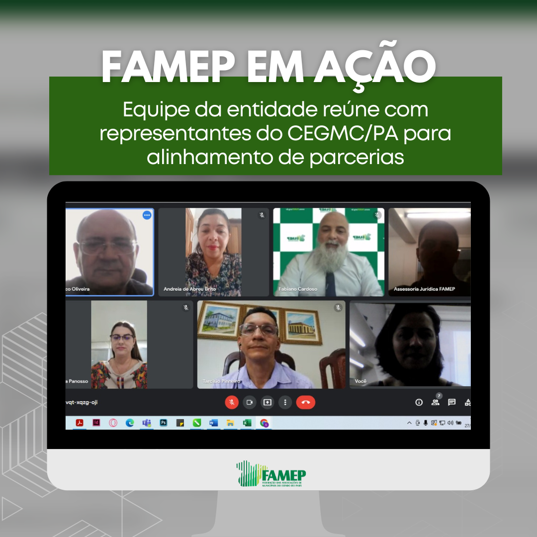 A equipe técnica da Federação das Associações de Municípios do Estado do Pará (FAMEP) representada pelo Diretor Técnico, Francisco Oliveira, o Assessor Jurídico Gianluca Alves e o Coordenador de Transferências Federais REDE +Brasil da FAMEP, Fabiano Cardoso, reuniu com a representante do GMC de Placas e Vice-presidente do COEGMC-PA, Andreia Britto, representante do GMC de Bragança e 1º Secretário do COEGMC-PA, Tarcísio Freitas, representante do GMC de Mojuí dos Campos e 2º Secretaria do COEGMC-PA, Claudia Panosso, e o representante do GMC de Altamira e Presidente do Colegiado Estadual de Gestores Municipais de Convênios (COEGMC – PA), Bruno Porto. Lembrando que o COEGMC-PA é um órgão de caráter consultivo que integra os colegiados de gestores de convênios municipais das associações de municípios de todo o estado do Pará, que atuam com políticas públicas financiadas, com recursos de transferências voluntárias das esferas de Governo Federal e Estadual, para fins de investimentos em obras e serviços.