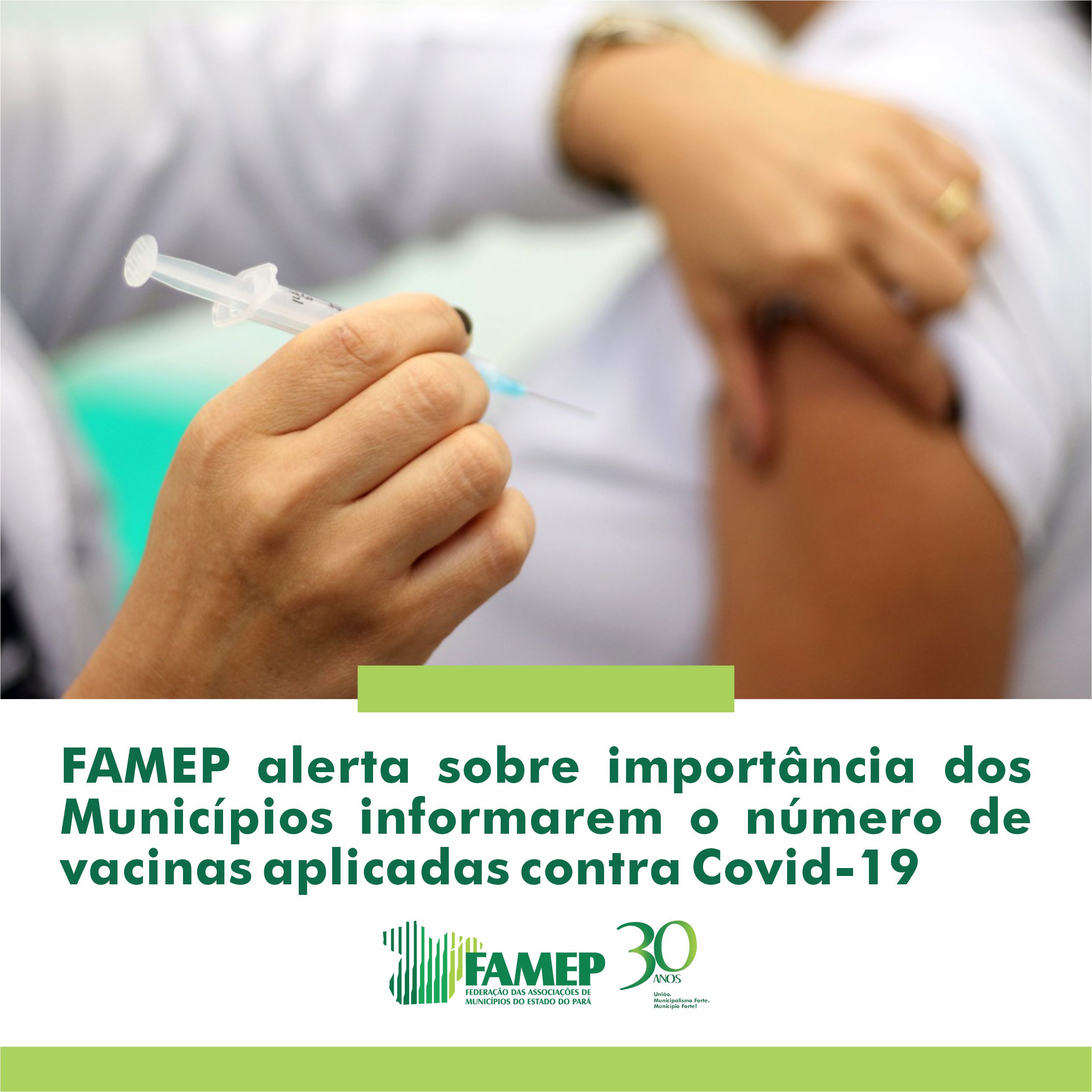 A Federação das Associações de Municípios do Estado do Pará (FAMEP) faz um alerta aos gestores municipais sobre a necessidade das Secretarias de Saúde dos 144 municípios do Pará informarem, com agilidade, o número de doses aplicadas de vacinas contra a Covid-19, para que o sistema Vacinômetro se mantenha atualizado. O apelo aos gestores municipais de Saúde é feito pelo presidente da Federação, Wagne Machado, reiterando um pedido anterior do diretor de Epidemiologia Bruno Pinheiro, da Secretaria de Estado de Saúde Pública (Sespa) no dia 11 de março.