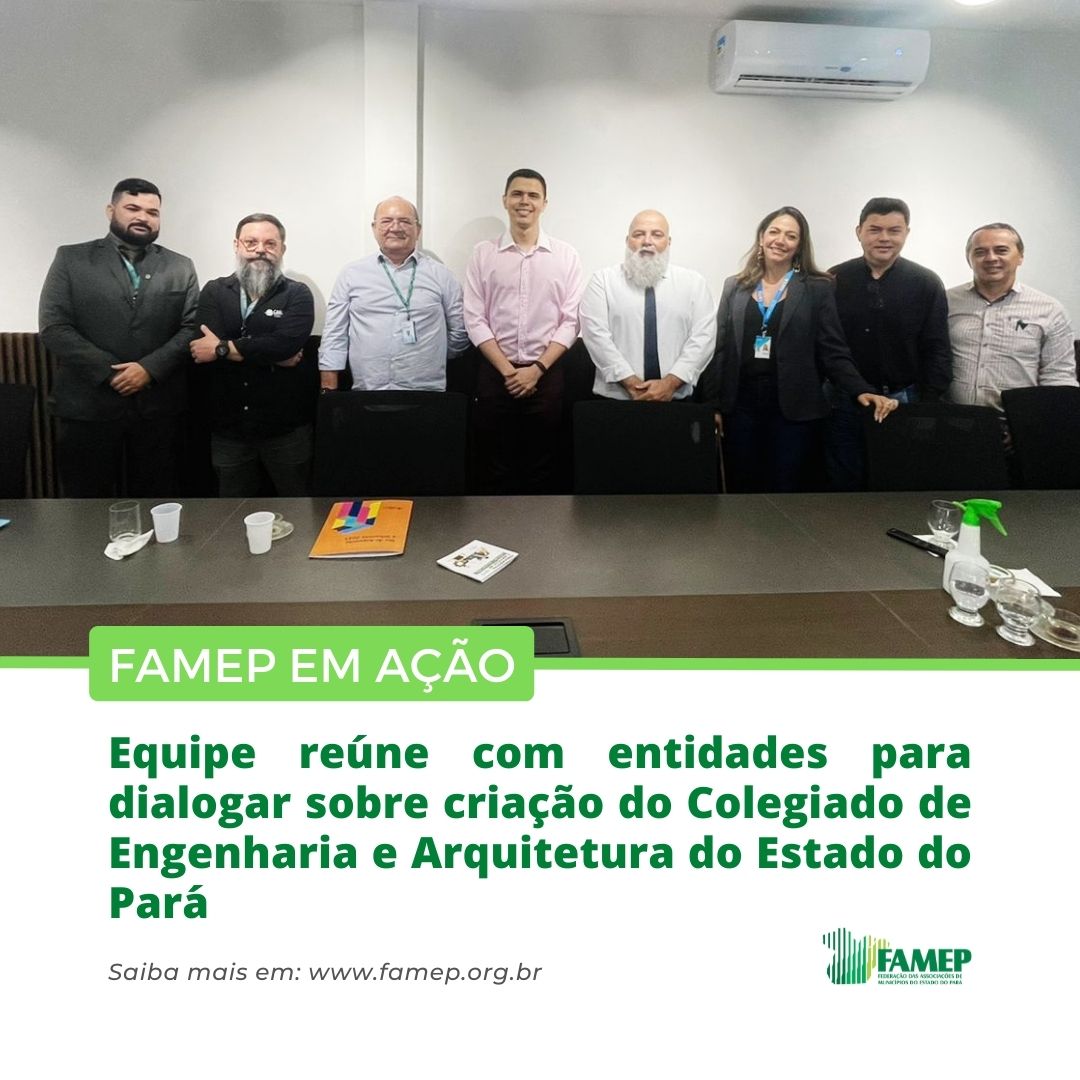 O objetivo principal da reunião foi dialogar sobre o projeto de Criação Colegiado Estadual de Engenharia e Arquitetura do Pará. Na oportunidade, as Entidades também debateram sobre a data para assinatura do protocolo de intenções e modelagem Estatuto; Criação do Grupo De trabalho com os Engenheiros e arquitetos municipais; Elaboração do Plano de trabalho do CEEA-PA; Delimitação do objetivo e projeto piloto; Viabilidade econômica de projetos e ações; Comunicação eficiente; Capacitações para equipes de engenharia e arquitetura municipal do Estado; Plataforma+ Brasil Módulo Empresas; CIPI – Cadastro integrado de Projetos de Investimento; BIM – Modelagem/Modelação da Informação da Construção; Estratégias de atuação; dentre outros.