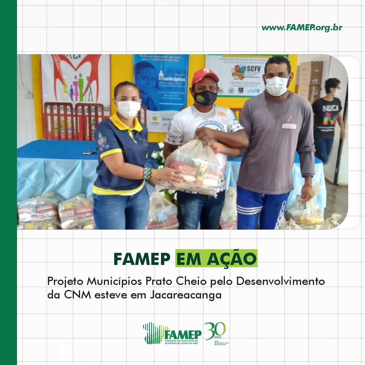 Nos dias 10, 11 e 12 de setembro, foi realizado no município de Jacareacanga, o Projeto Municípios Prato Cheio pelo Desenvolvimento, uma ação da CNN em parceria com a FAMEP e outras entidades e que tem como objetivo, beneficiar 375 famílias em situação de vulnerabilidade que foram atingidas pandemia da Covid-19.