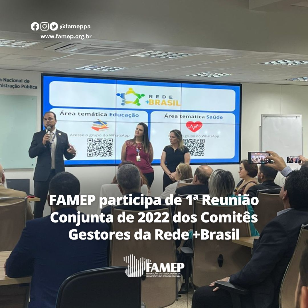 A 1ª Reunião Conjunta de 2022 dos Comitês Gestores da Rede +Brasil (Elos Contas e Controle, União, Estados e Municípios) aconteceu nos dias 6 e 7 de dezembro, em Brasília. O importante evento contou com a participação da equipe da Federação das Associações de Municípios do Estado do Pará (FAMEP), representados pelo Diretor Administrativo e Financeiro Carlos Picanço, o Diretor Técnico Francisco Oliveira e o Coordenador de Transferências Federais FAMEP Rede +Brasil Elo Municípios, Fabiano Cardoso.