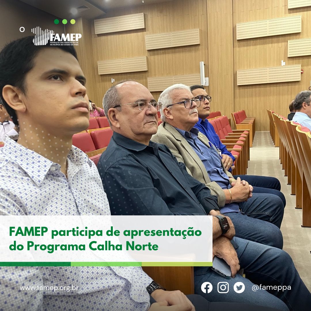 Equipe da Federação das Associações de Municípios do Estado do Pará (FAMEP) representada pelo Diretor Administrativo e Financeiro Carlos Picanço, o Diretor Técnico Francisco Oliveira, o Assessor Juridico Gianluca Quaresma e o Assessor Técnico Fabiano Cardoso participa na manhã desta sexta-feira, 18 de novembro, da Palestra sobre o Programa Calha Norte (PCN), desenvolvida pelo Conselho Estadual Trabalho, Emprego e Renda e a Secretaria de Estado de Assistência Social, Trabalho, Emprego e Renda, com apoio da FAMEP e Associações e Consórcios Regionais.