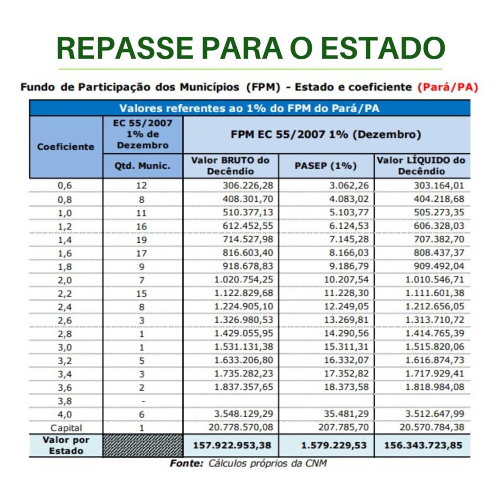 O repasse adicional de 1% em dezembro do Fundo de Participação dos Municípios (FPM) – no valor total de R$ 156.343.723,85– será creditado às prefeituras paraenses nesta segunda-feira (9), até as 18 horas. Na terça-feira (10), ocorre o repasse do primeiro decêndio do mês. A quantia extra é fruto de conquista da Confederação Nacional de Municípios (CNM) e do movimento municipalista em 2007 por meio da Emenda Constitucional 55.