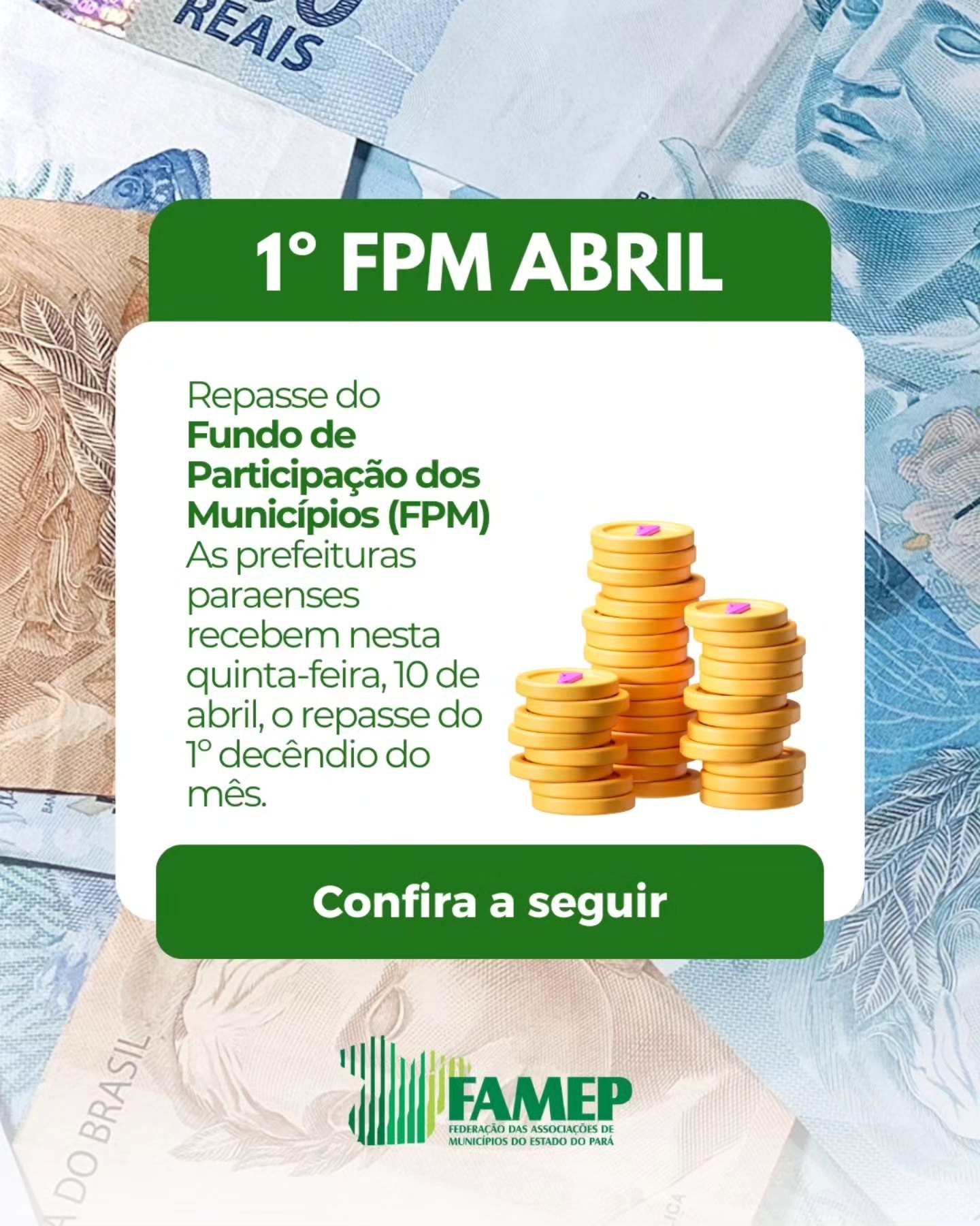 Será creditado nesta quinta-feira, 10 de abril, nas contas das prefeituras paraenses, o repasse do Fundo de Participação dos Municípios (FPM) referente ao 1º decêndio do mês, no valor de R$ 195.707.723,70, já descontada a retenção do Fundeb. Em valores brutos, incluindo o Fundeb, o montante é de R$ 247.731.295,82.