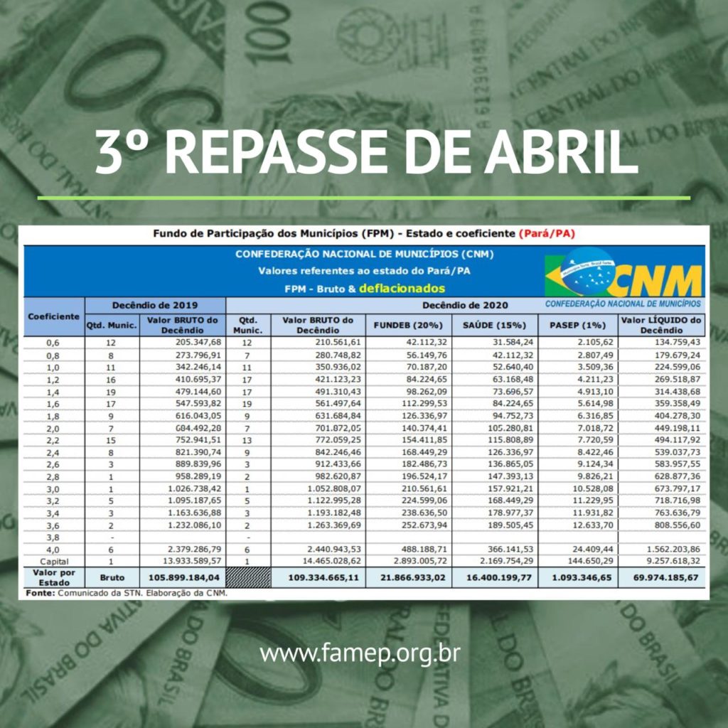 A Federação das Associações de Municípios do Estado do Pará (FAMEP) informa que o terceiro decêndio do Fundo de Participação dos Municípios (FPM) de abril será depositado nas contas das prefeituras paraenses no próximo dia 30 de abril. No total, os cofres municipais recebem o valor de R$ 69.974.185,67, já descontada a retenção do Fundo de Manutenção e Desenvolvimento da Educação Básica e de Valorização dos Profissionais da Educação (Fundeb). Em valores brutos, o montante é de R$ 109.334.665,11.