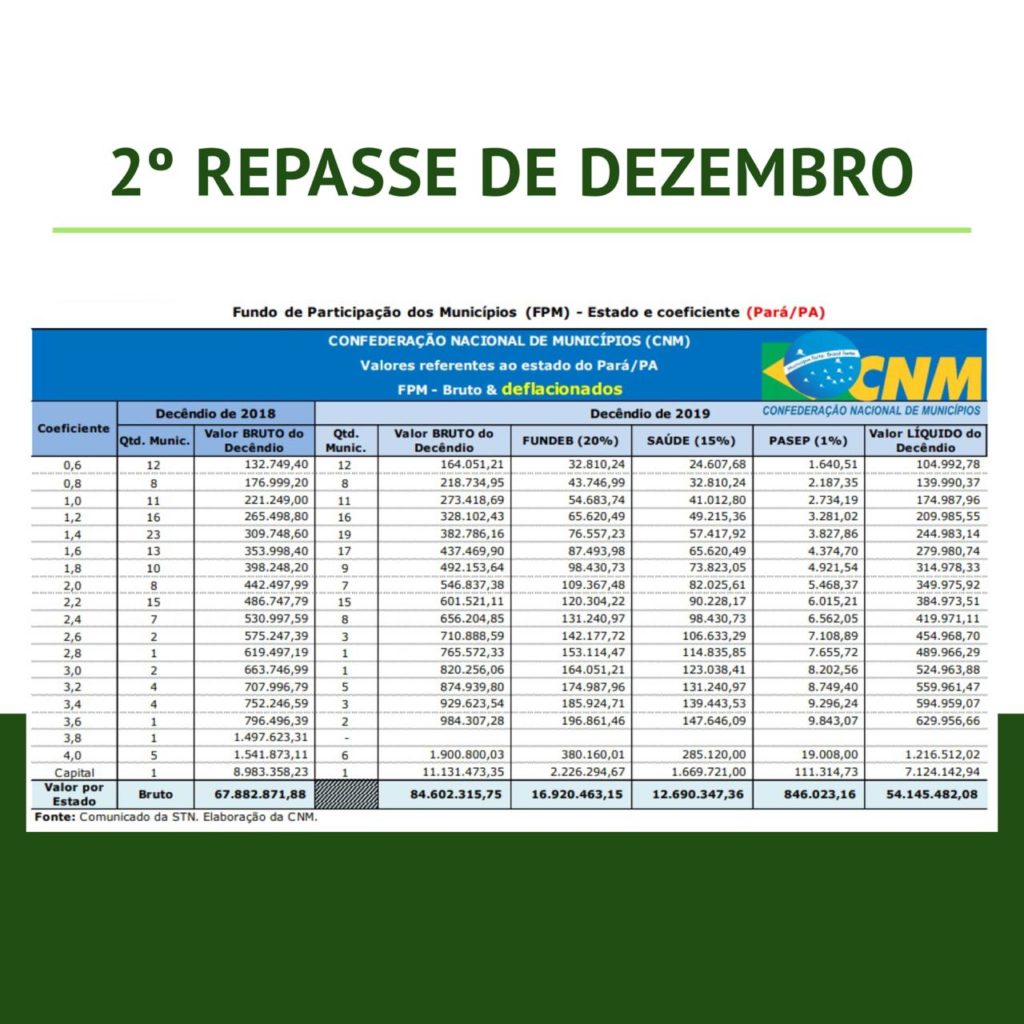 Na próxima sexta-feira (20), os cofres municipais de todo Estado do Pará recebem o segundo decêndio do Fundo de Participação dos Municípios (FPM). O repasse soma o total de R$ 54.145.482,08, já descontada a retenção do Fundo de Manutenção e Desenvolvimento da Educação Básica e de Valorização dos Profissionais da Educação (Fundeb). Em valores brutos, incluindo o Fundeb, o montante é de R$ 84.602.315,75.