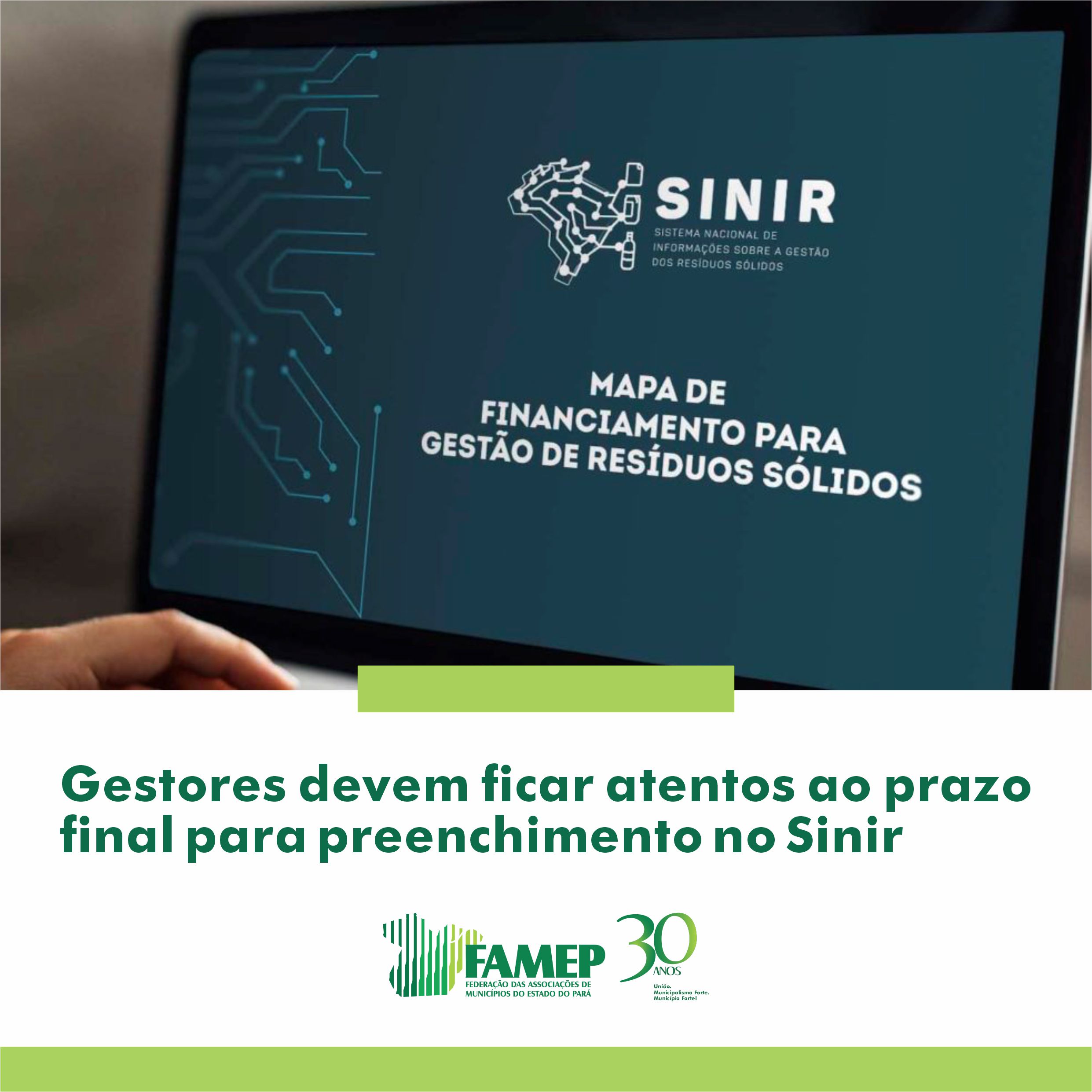 A área técnica de Saneamento da Confederação Nacional de Municípios (CNM) e a Federação das Associações de Municípios do Estado do Pará (FAMEP) lembram aos gestores municipais sobre a data final de preenchimento do Sistema Nacional de Informações sobre a Gestão dos Resíduos Sólidos (Sinir). O ano base 2020 se encerra no dia 30 de abril, conforme a Portaria 412/2019 do Ministério do Meio Ambiente.