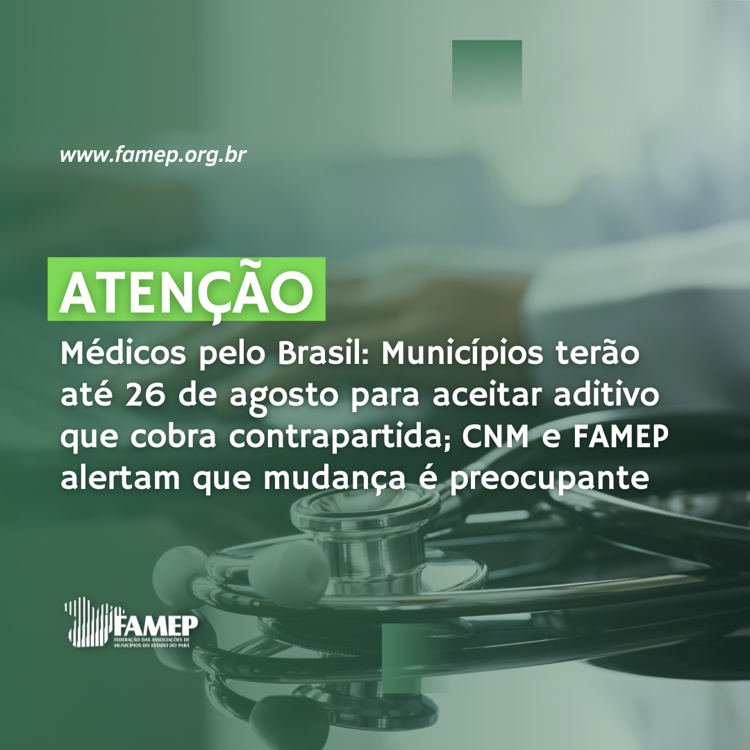 A Confederação Nacional de Municípios (CNM) e A Federação das Associações de Municípios do Estado do Pará (FAMEP) veem com preocupação a contrapartida obrigatória dos Municípios para adesão ao Programa e o descredenciamento dos Municípios em caso de não concordância. Outro ponto de atenção é o curto prazo para o aceite da nova regra.