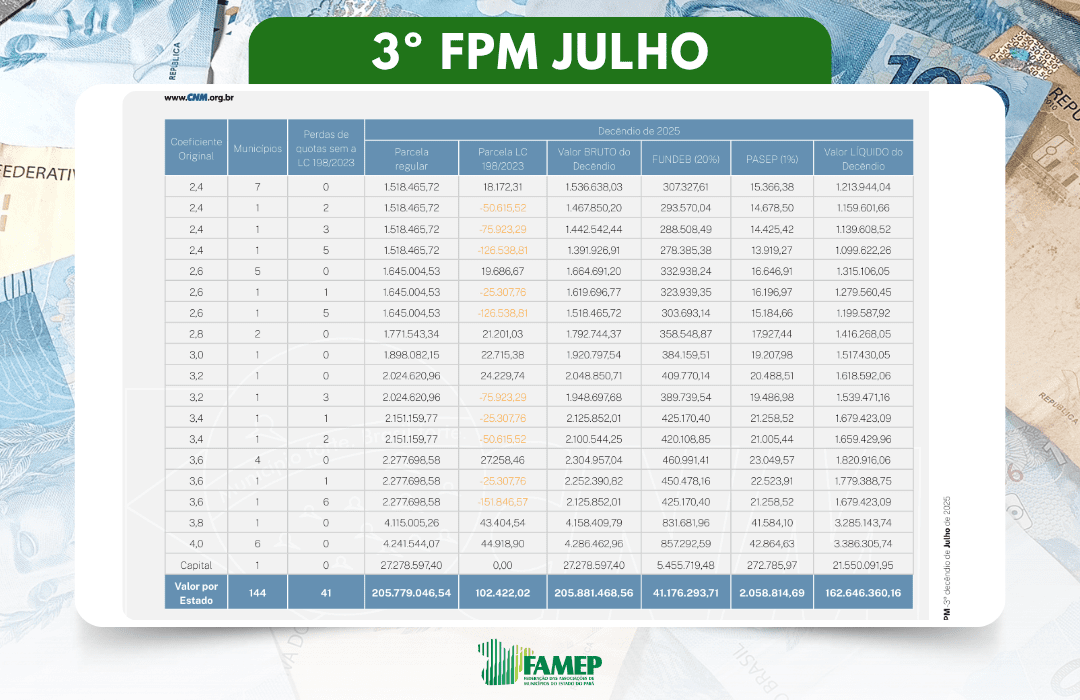 Considerando o acumulado do ano de 2025, incluindo o repasse extra do FPM do 1% de julho, o FPM apresenta um crescimento nominal de 9,85% em relação ao mesmo período do ano anterior, representando um acréscimo de quase R$ 12,3 bilhões.