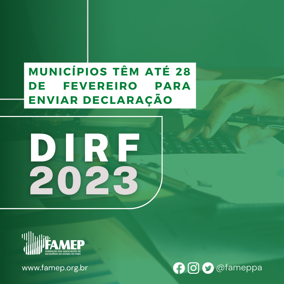 A Confederação Nacional de Municípios (CNM) e a Federação das Associações de Municípios do Estado do Pará (FAMEP) informam que as administrações municipais têm até o dia 28 de fevereiro para o envio da Declaração do Imposto de Renda na Fonte (Dirf) 2023, referente ao ano calendário de 2022. A declaração é entregue anualmente referente às seguintes informações, de acordo com a Receita Federal do Brasil (RFB):