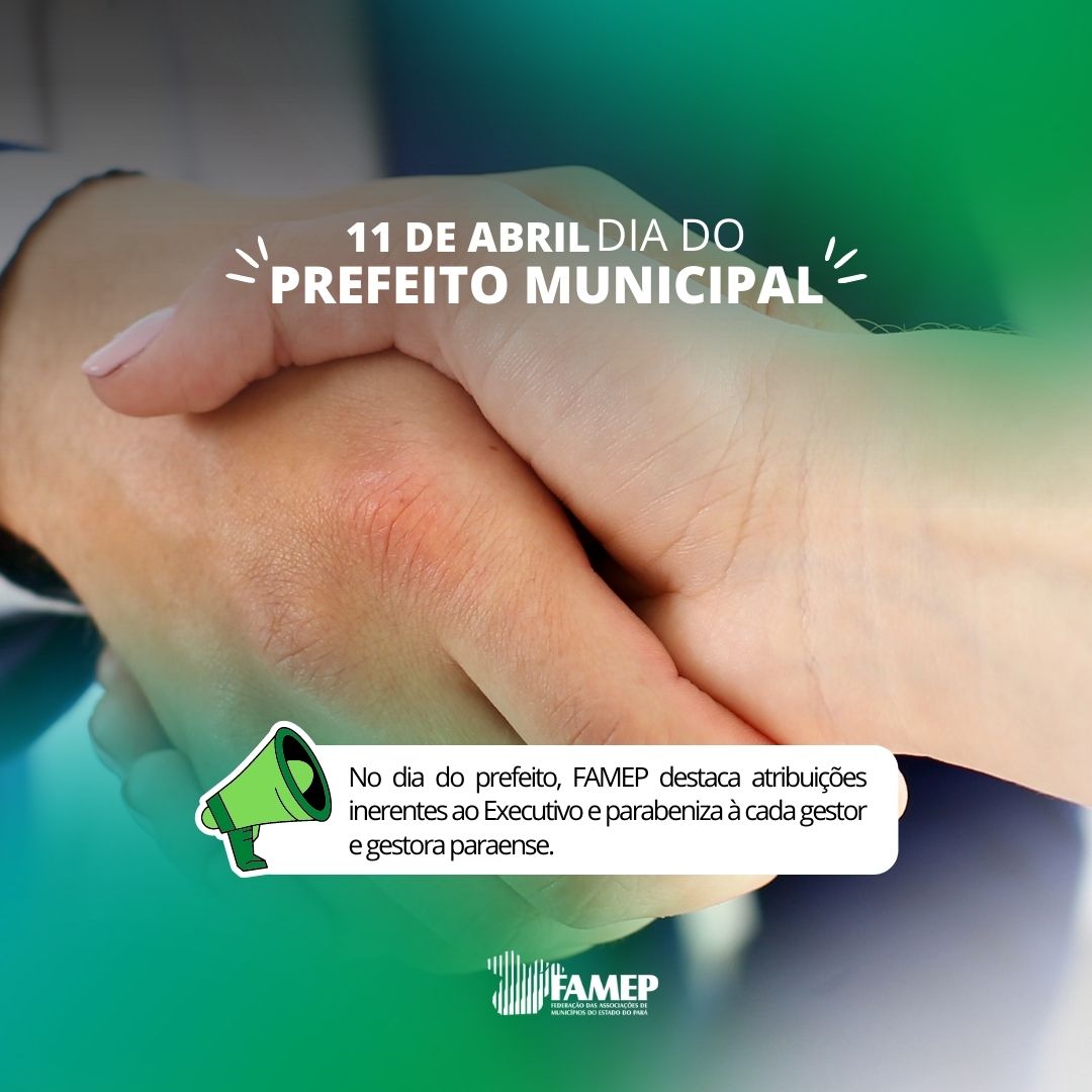 Em comemoração à data simbólica de 11 de abril, dia do prefeito, a Federação das Associações de Municípios do Estado do Pará (FAMEP), em homenagem à todos os seus 141 filiados, destaca algumas atribuições do executivo. Como meio de apresentar à população as atribuições das prefeituras municipais. O presidente da Entidade e prefeito de Santarém, Nélio Aguiar, agradece à cada gestor e gestora que fazem parte da FAMEP e batalham todos os dias, juntos, pelo desenvolvimento dos municípios do Pará. “Para a FAMEP, todos os dias são dia dos prefeitos e prefeitas filiados, pois são todos os dias que estamos à postos para auxiliá-los e recebermos da melhor forma, também são todos os dias que batalhamos pelo municipalismo e pelo desenvolvimento do nosso Estado, juntos, já obtivemos grandes conquistas e continuando essa parceria, iremos ainda mais adiante em prol das nossas pautas municipalistas”, disse Aguiar.