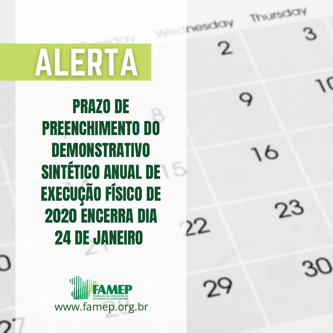O Demonstrativo Sintético Anual de Execução Físico – Financeira foi disponibilizado no dia 23 de novembro de 2021 para o preenchimento das informações referentes à prestação de contas do ano de 2020 de acordo com a Portaria 138/2021. A Confederação Nacional de Municípios (CNM) e a Federação das Associações de Municípios do Estado do Pará (FAMEP) chamam atenção dos gestores municipais da área de Assistência Social em relação ao prazo que se encerra no dia 24 de janeiro de 2022. Já conselhos municipais terão até o dia 23 de fevereiro de 2022 para poder analisar as informações fornecidas pelos gestores.