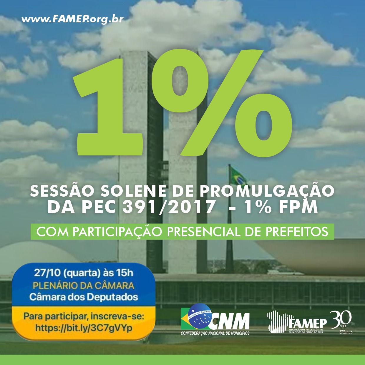 A Constituição Federal de 1988 receberá a emenda 112 determinando que a União repasse mais 1% dos Impostos de Renda e Sobre Produtos Industrializados (IR e IPI) para os Municípios. A promulgação da PEC, que representa R$ 1,097 bilhão a mais para as prefeituras já em 2022, ocorrerá no Plenário da Câmara dos Deputados.
