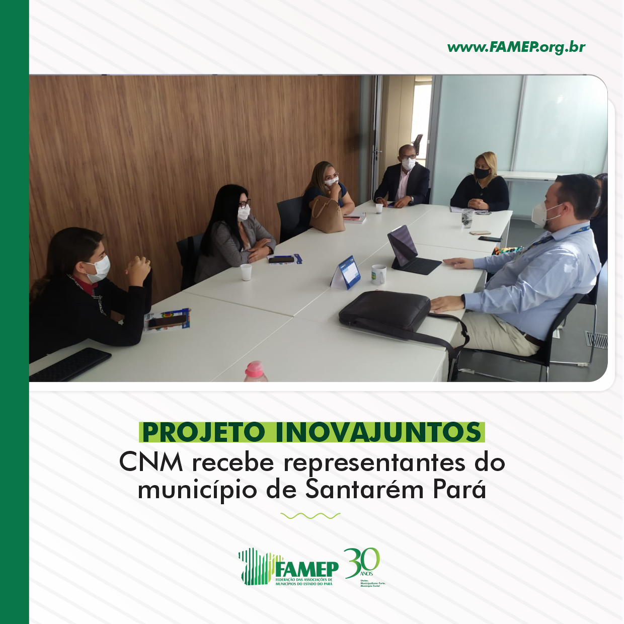 Nesta terça-feira, 3 de agosto, a equipe do Projeto InovaJuntos, da Confederação Nacional de Municípios (CNM), recebeu representantes do Município de Santarém (PA) em Brasília. A Federação das Associações de Municípios do Estado do Pará (FAMEP), explica que o encontro teve o objetivo de esclarecer dúvidas e trabalhar formas de atuação nas demandas citadas no âmbito do Projeto. A cidade foi selecionada no Cluster 1 – Desenvolvimento Econômico e Inovação.