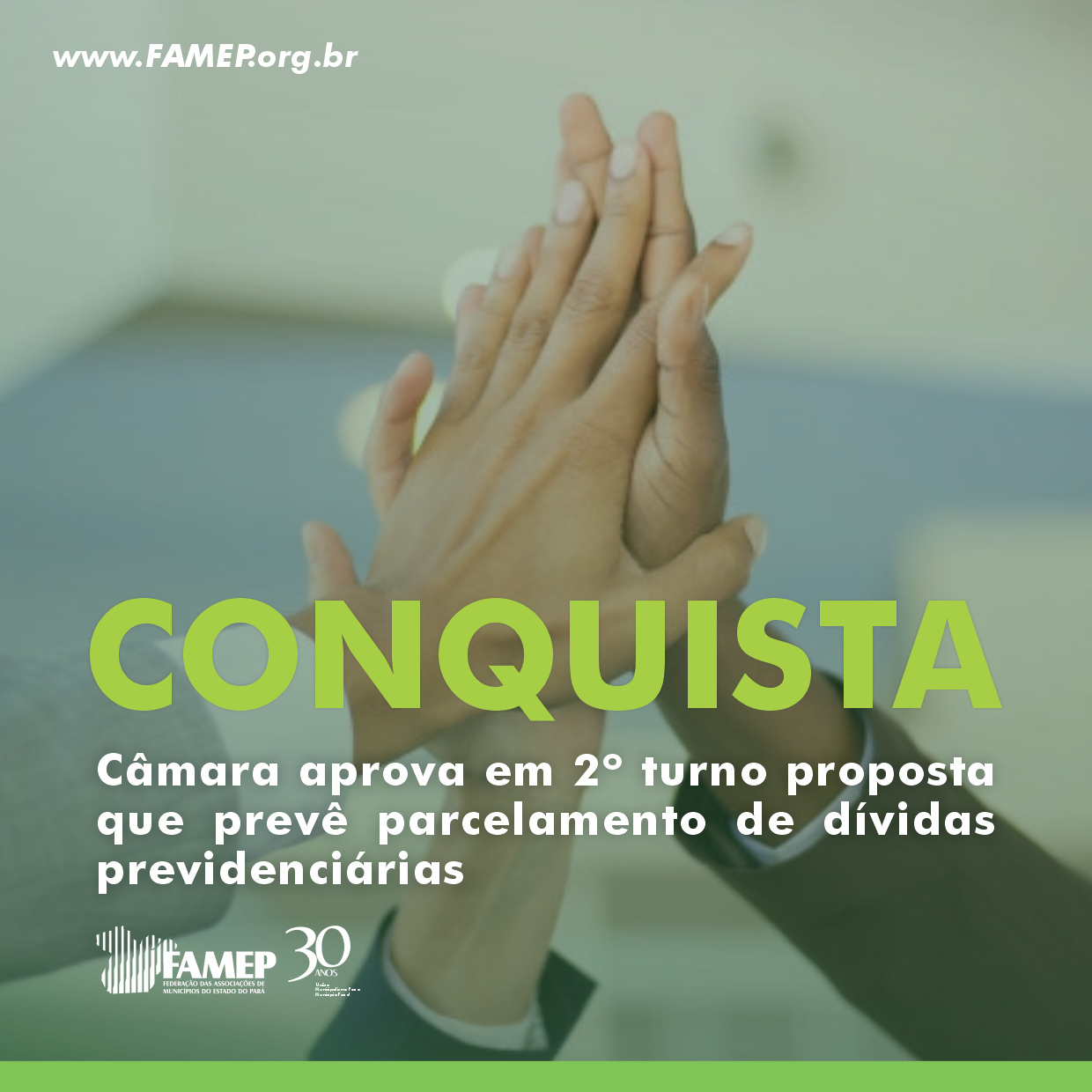 A Federação das Associações de Municípios do Estado do Pará (FAMEP) participou de forte mobilização de gestores municipais em Brasília, liderada pela Confederação Nacional de Municípios (CNM), a Câmara dos Deputados aprovou na noite desta terça, 9 de novembro, a Proposta de Emenda à Constituição (PEC) 23/2021, com a inclusão do parcelamento das dívidas previdenciárias dos Municípios com os regimes geral e próprio de previdência. A inclusão do texto na proposta foi uma articulação do presidente da CNM, Paulo Ziulkoski. A matéria, uma das pautas prioritárias da Mobilização Municipalista realizada pela entidade, com apoio das Federações, contou com a participação de quase 500 gestores e, pode significar economia de R$ 36 bilhões aos entes locais. Os deputados ainda analisam os destaques. Em seguida, a PEC segue para o Senado.