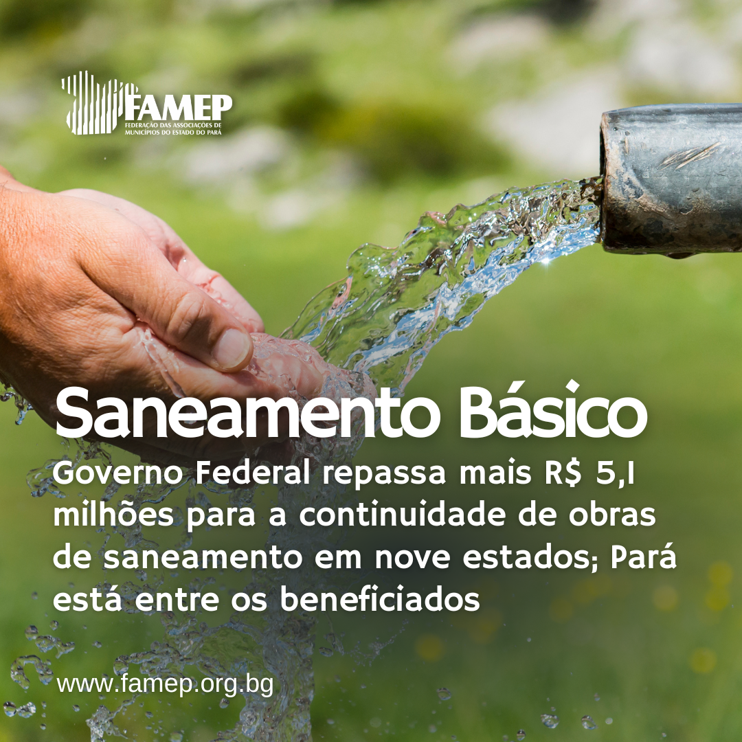A Federação das Associações de Municípios do Estado do Pará (FAMEP) informa que o Governo Federal, por meio do Ministério do Desenvolvimento Regional (MDR), vai repassar R$ 5,1 milhões para a continuidade de obras de saneamento básico em nove estados do país. Serão beneficiados municípios da Bahia, Goiás, Minas Gerais, Pará, Pernambuco, Rondônia, Rio Grande do Sul, Sergipe e Roraima.