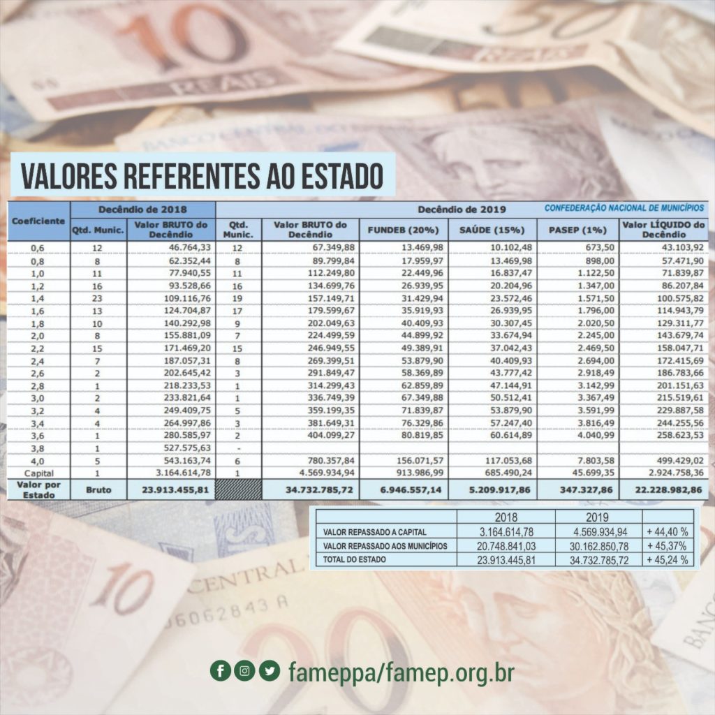 A diminuição também ocorreu no primeiro decêndio. Em valores brutos, ou seja, incluindo o Fundeb, o montante do segundo repasse será de R$ 34.732.785,72. De acordo com os estudos técnicos da Federação das Associações de Municípios do Estado do Pará (FAMEP), o segundo decêndio de outubro de 2019, comparado com o mesmo decêndio do ano anterior, indica crescimento de 45,24% em termos nominais (valores sem considerar os efeitos da inflação).