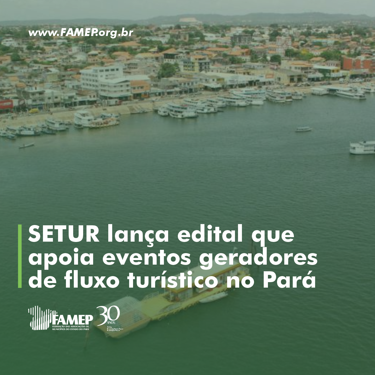 A Federação das Associações de Municípios do Estado do Pará (FAMEP) divulga o edital publicado pela Secretaria de Estado de Turismo (SETUR) que apoia eventos geradores de fluxo turístico nos municípios do Estado de Pará e ações de promoção realizadas fora do território estadual. O certame selecionará municípios paraenses com os quais serão firmadas parcerias por meio de Termo de Colaboração para execução dessas ações.