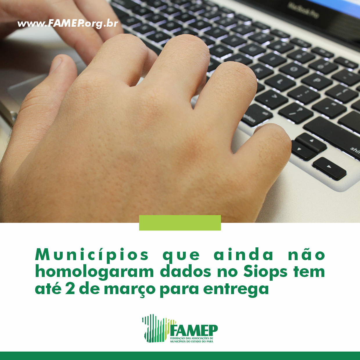 A Confederação Nacional de Municípios (CNM) e a Federação das Associações de Municípios do Estado do Pará (FAMEP) alertam aos gestores municipais que o prazo para o preenchimento e homologação dos dados sobre gastos públicos em saúde do 6º bimestre de 2020 no Sistema de Informações sobre Orçamentos Públicos em Saúde (Siops) encerra dia 2 de março. No total, 83 municípios paraenses ainda não declaram.