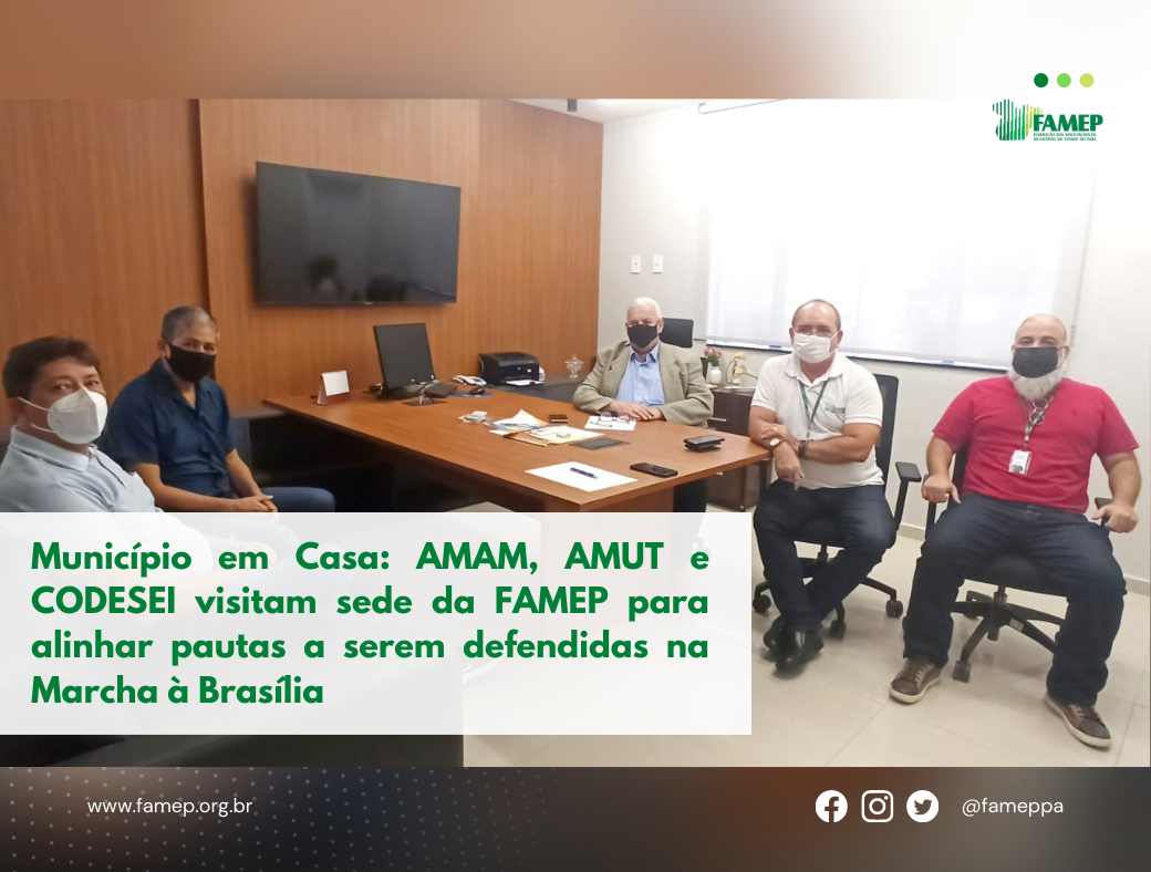 Na reunião, o diretor administrativo e financeiro da FAMEP juntamente com o coordenador técnico, Francisco Oliveira e o Técnico Fabiano Cardoso, apresentaram aos secretários o planejamento e reestruturação da entidade, com a nova proposta de modelagem para o atendimento da área técnica, o que irá estreitar e reforçar as relações da Federação com as demais associações e consórcios regionais. As equipes também dialogaram sobre a XXIII Marcha, que acontecerá do dia 25 a 28 de abril em Brasília, onde, foi solicitado o levantamento das demandas das regiões para que a FAMEP inclua na Pauta Municipalista do Estado, que será apresentada a Bancada Paraense no período da Marcha.