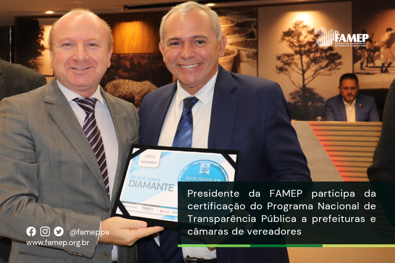 O presidente da Federação das Associações de Municípios do Estado do Pará (FAMEP) e prefeito de Santarém, Nélio Aguiar participou na manhã desta quarta-feira, 25 de janeiro, no auditório da sede do Tribunal de Contas dos Municípios do Pará (TCM-PA), em Belém, da entrega da certificação do Programa Nacional de Transparência Públicas a prefeituras e câmaras de vereadores, que foram classificadas na iniciativa realizada pela Associação dos Membros dos Tribunais de Contas do Brasil (Atricon), Instituto Rui Barbosa (IRB), Associação Brasileira dos Tribunais de Contas dos Municípios (Abracom), Conselho Nacional dos Presidentes dos Tribunais de Contas (CNPTC), Tribunal de Contas do Estado do Mato Grosso (TCE-MT) e Conselho Nacional de Controle Interno (Conaci).