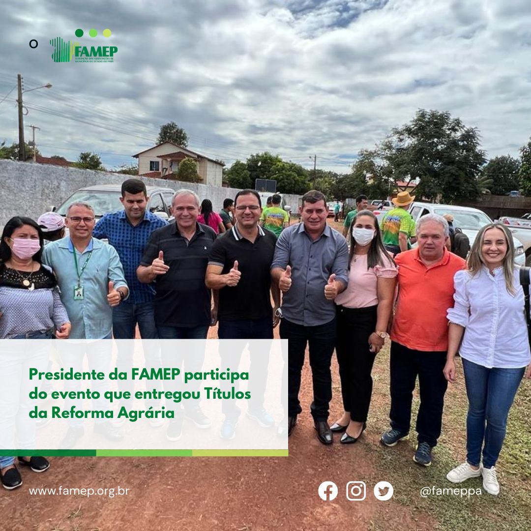 Para compor a mesa no evento estiveram presentes, além do presidente da FAMEP, a Diretora de Governança Fundiária do INCRA Eleusa Gutemberg, o Diretor de Desenvolvimento e Consolidação de Assentamentos do INCRA Giuseppe Serra Seca Vieira, o Senador Zequinha Marinho, o Deputado Federal Júnior Ferrari, o Prefeito de Rurópolis Taká, o Superintendente do INCRA no Oeste do Pará Francisco de Souza, o Prefeito de Uruará Gilson Brandão, o Prefeito de Mojuí dos Campos Marco Antônio, o prefeito de Senador José Porfírio Dirceu Biancardi, o vice-prefeito de Placas Leonir Hermes, vice-prefeito de Trairão Maurício, secretário de Altamira Gustavo Mafra.