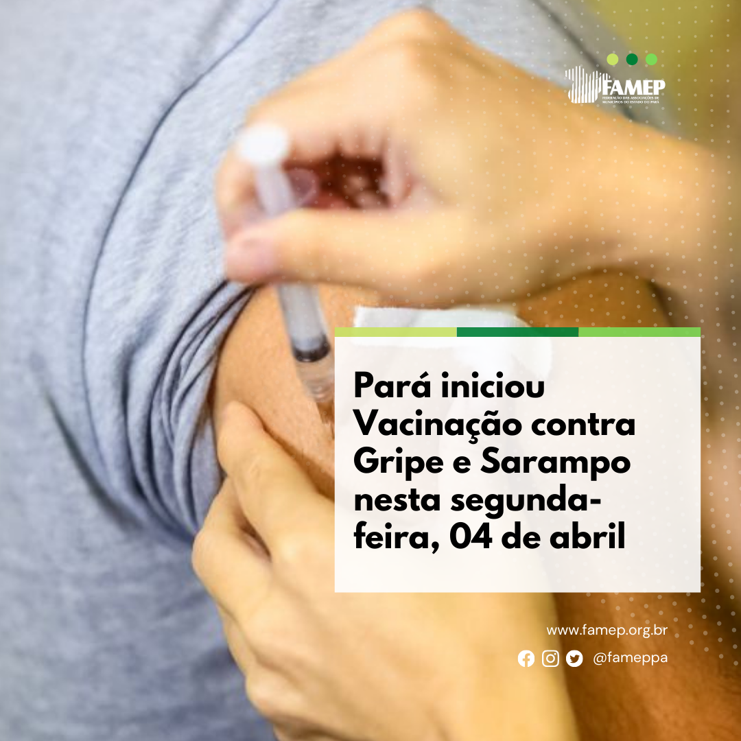 A Federação das Associações de Municípios do Estado do Pará (FAMEP) informa que a primeira Campanha Nacional de Vacinação contra Gripe e Sarampo de 2022, começou nesta segunda-feira, 4 de abril. Com isso, a Secretaria de Estado de Saúde Pública (Sespa) anuncia a intensificação da imunização da população do Pará com as vacinas tríplice viral contra o sarampo e influenza contra a gripe.