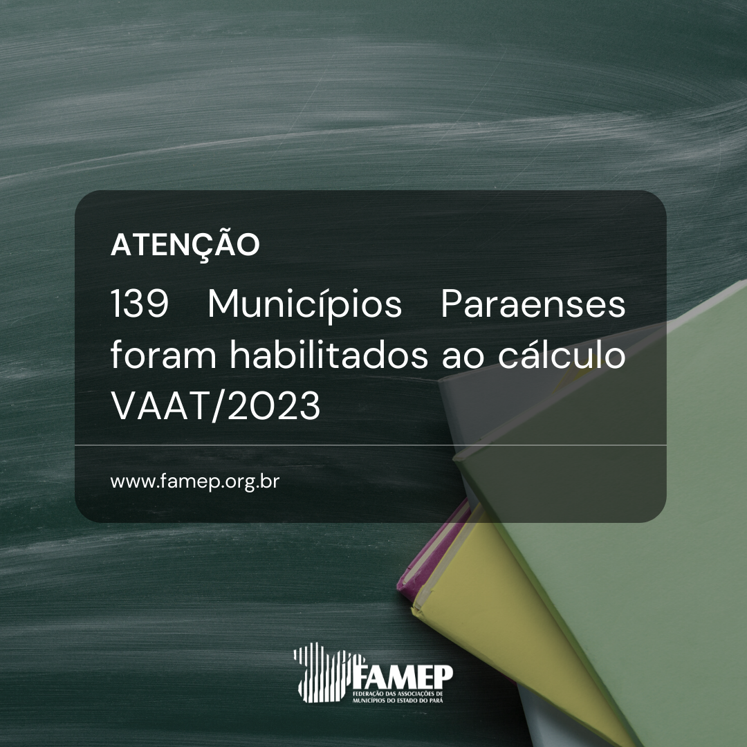 O Fundo Nacional de Desenvolvimento da Educação (FNDE) divulgou, nesta segunda-feira, 10 de outubro, comunicado em que revela que, após a análise realizada pela autarquia e pela Secretaria do Tesouro Nacional (STN), foram apurados 5.526 entes subnacionais considerados habilitados ao cálculo do VAAT/2023, entre eles 139 são municípios paraenses e 69 entes subnacionais considerados inabilitados ao cálculo do VAAT/2023. A Federação das Associações de Municípios do Estado do Pará (FAMEP) listou os municípios paraenses com suas respectivas situações, que pode ser consultada na tabela em anexo ao final desta matéria.