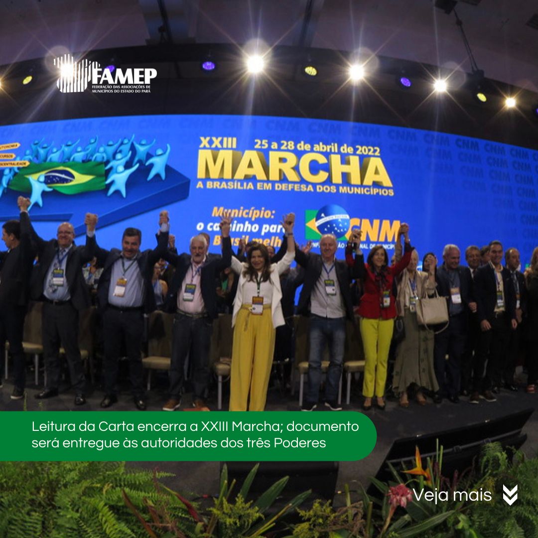 A XXIII Marcha a Brasília em Defesa dos Municípios foi encerrada oficialmente nesta quinta-feira, 28 de abril, com a leitura da Carta Municipalista, que será entregue aos presidentes da República, Jair Bolsonaro; do Congresso, Rodrigo Pacheco; e do Supremo Tribunal Federal (STF), Luiz Fux. Tradicionalmente, a leitura do documento elenca os principais acontecimentos do evento e destaca os debates com os representantes dos três Poderes.